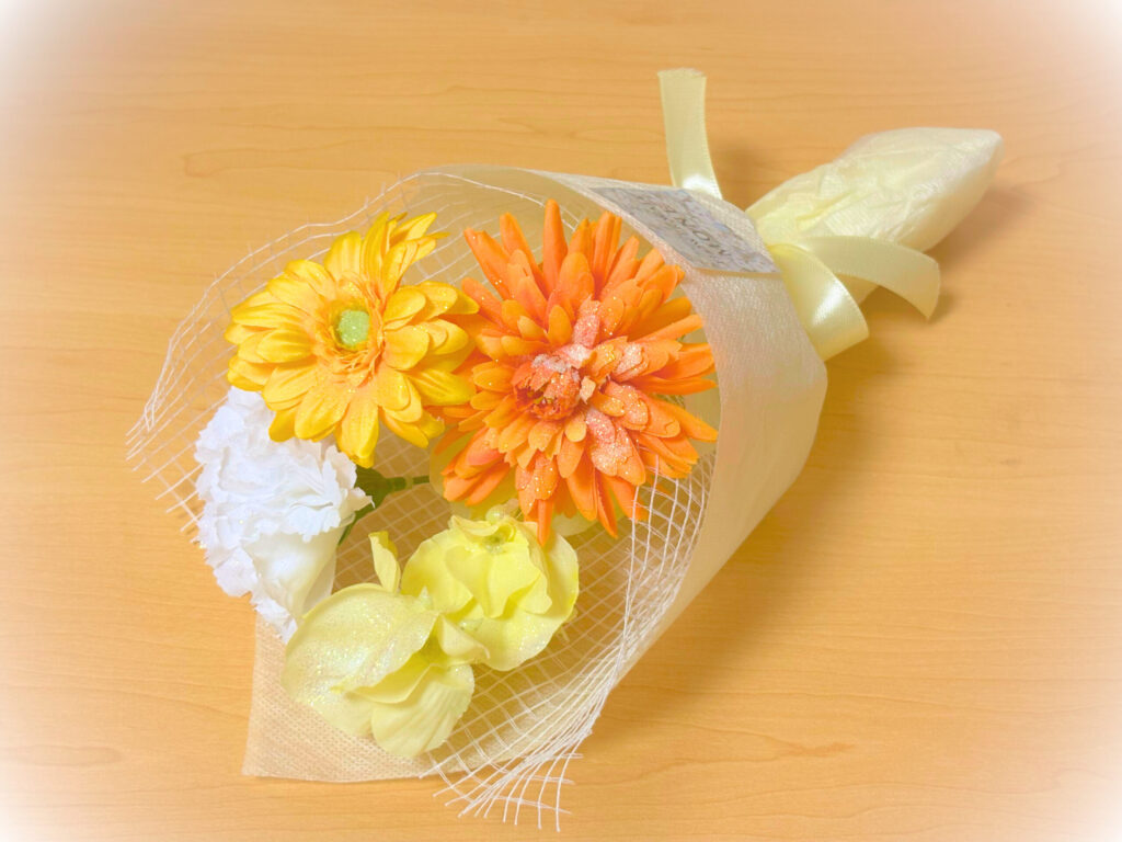 「元気の出るオレンジ系の花束」「今日渡さないなら保存のきくアーティフィシャルフラワー」と提案してもらいました。